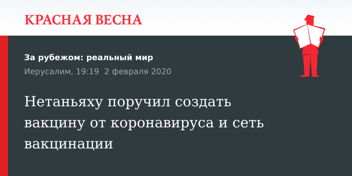 Поручение Институту биологических исследований и Министерству здравоохранения Израиля разработать вакцину от коронавируса и создать в стране сеть вакцинации дал премьер-министр Израиля Биньямин Нетаньяху 2 февраля, сообщает пресс-служба канцелярии премьер-министра.