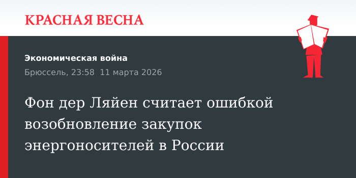 Возвращение Евросоюза к закупкам российских энергоресурсов назвала «стратегической ошибкой», которая сделает страны сообщества «уязвимыми», глава Еврокомиссии Урсула фон дер Ляйен 11 марта.
