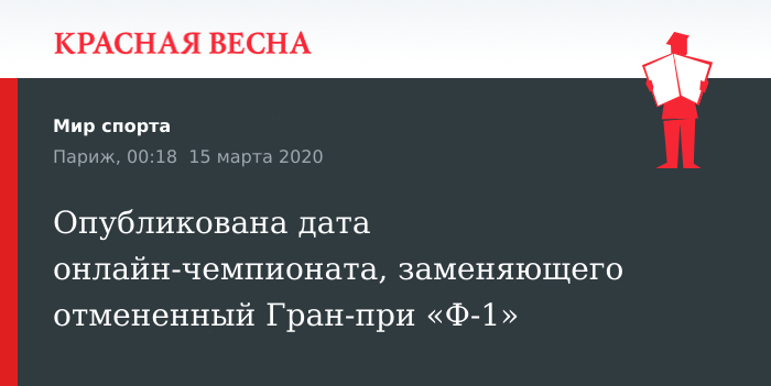 Виртуальный заезд, вместо отмененного из-за коронавируса первого этапа чемпионата «Формулы-1», состоится в ту же дату — 15 марта. Об этом 14 марта сообщает французское издание F1only.