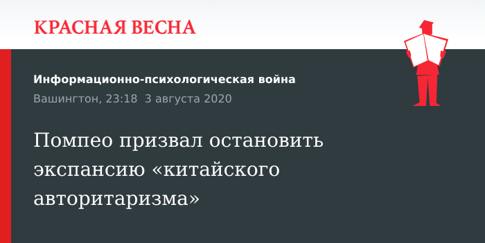 «Пекину нельзя позволить экспортировать его модель авторитарного правления», — написал Помпео. По его мнению, компартия Китая нацелена распространить вступивший в силу с 30 июля закон «О национальной безопасности Гонконга» к людям по всему миру.