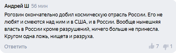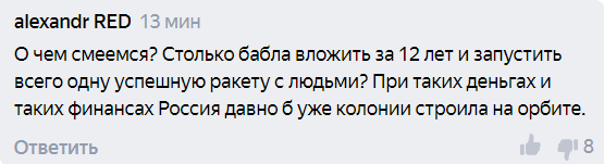 Не лучше обстановка и в космической отрасли США, отмечают пользователи. США вложили огромные деньги в создание корабля Илона Маска. На эти деньги, считает комментатор, Россия бы смогла построить «колонии на орбите». Да только читатели с ним не согласились — это тот случай, когда успех обеспечивается не только лишь выделенными деньгами — воровство, деградация науки, промышленности, интеллектуального потенциала работников привели к развалу отрасли.