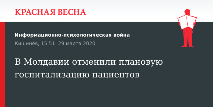Для предотвращения распространения коронавирусной инфекции приостанавливается плановая госпитализация, сообщает комиссия по чрезвычайным ситуациям Молдавии 28 марта, передает интернет-ресурс NewsMaker.