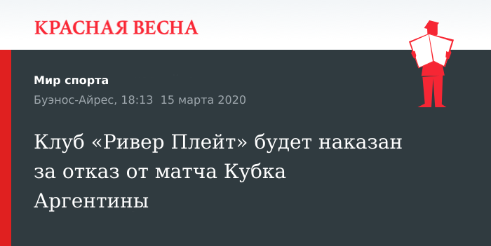 Футбольный клуб из Буэнос-Айреса «Ривер Плейт» будет наказан за односторонний отказ из угрозы распространения коронавируса от участия в матче чемпионата Аргентины по футболу с командой «Атлетико Тукуман» из Сан-Мигель-де-Тукумана. Об этом 15 марта сообщил вице-президент второй Суперлиги страны, отвечающий за пост президента, Марселло Тинелии, его слова приводит пресс-служба аргентинского чемпионата.