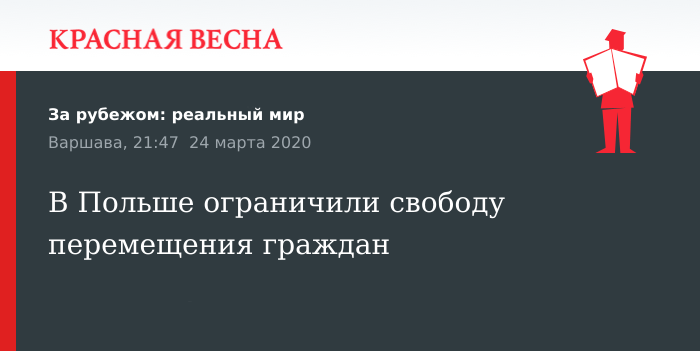 Ограничения на перемещение и собрания ввели в Польше для борьбы с коронавирусом, заявил 24 марта премьер-министр страны Матеуш Моравецкий в ходе пресс-конференции.