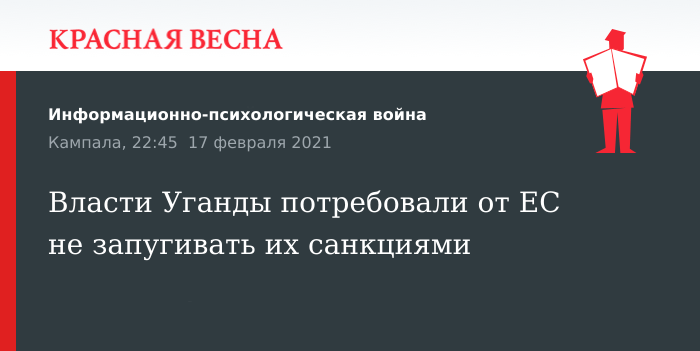 Предложение Европейского парламента о наложении санкций на правительственных чиновников Уганды за предполагаемые нарушения прав человека во время всеобщих выборов в стране 14 января высмеяли власти страны 17 февраля, сообщает «Синьхуа».