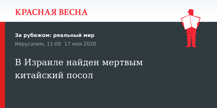 Как сообщается, тело китайского посла было найдено сегодня утром. Эту информацию изданию подтвердил официальный представитель МИД Израиля. При этом китайское посольство пока не подтвердило эту информацию.