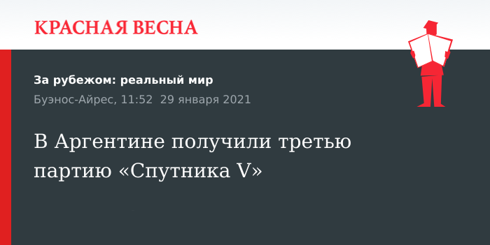Напомним, первые две партии состояли из 300 тыс. вакцин. Всего планируется поставить в январе-феврале 10 млн доз вакцины. Однако накануне российская сторона заявила о возможности задержек на несколько недель с поставками «Спутника V» из-за повышенного спроса на вакцину в Латинской Америке.