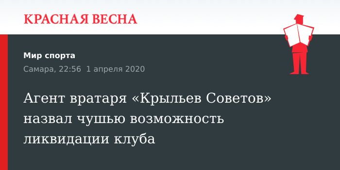 Полной чушью назвал информацию о предстоящей ликвидации самарского футбольного клуба «Крылья Советов» агент вратаря команды Сергея Рыжикова Алексей Сафонов 1 апреля в интервью телерадиокомпании «Новый век».