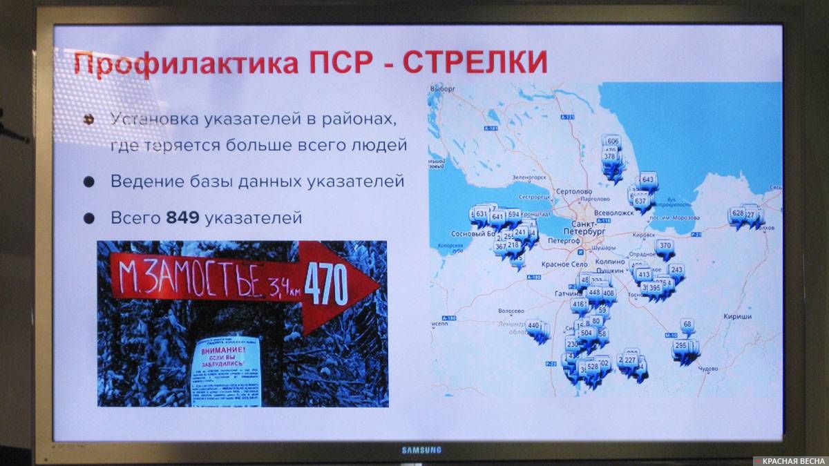 Заместитель командира поисково-спасательного отряда «Экстремум» Елена Кузнецова рассказала также о программе профилактике «Стрелки». Каждый год анализируются те районы, где чаще всего теряются люди, и вне сезона в этих районах ставятся указатели с направлением выхода и номером, который поможет установить местоположение потерявшегося человека. Программа оказалась эффективной — в тех района, где поставлены стрелки, резко снизилось количество заявок о помощи, регулярно приходят благодарности за размещение этих знаков. Всего установлено уже 849 стрелок.