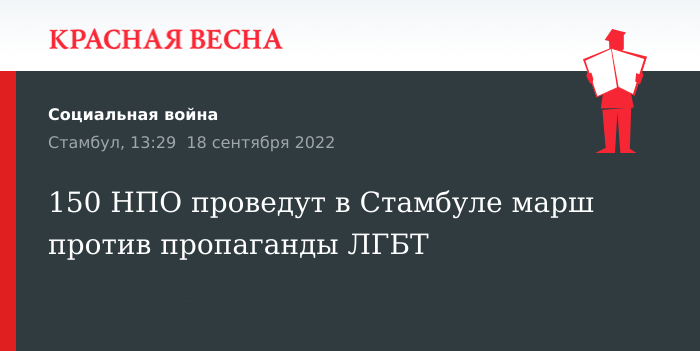 150 неправительственных организаций проведут в Стамбуле шествие за традиционную семью под лозунгом «Защити свою семью и поколение, останови извращения», 18 сентября сообщила газета Yeni Safak.