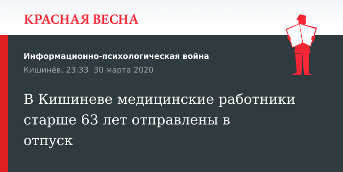 Сотрудники учреждений здравоохранения, чей возраст превышает 63 года, отправлены в отпуск, заявили в управлении здравоохранения мэрии Кишинева, 30 марта сообщает агентство «Sputnik Молдавия».