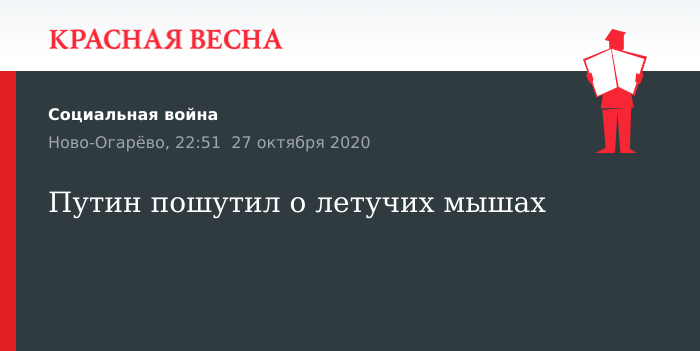 Президент России Владимир Путин пошутил по поводу «невиновности» летучих мышей в ситуации с коронавирусом в ходе заседания Совета по культуре и искусству в Ново-Огарево, прошедшего 27 октября.