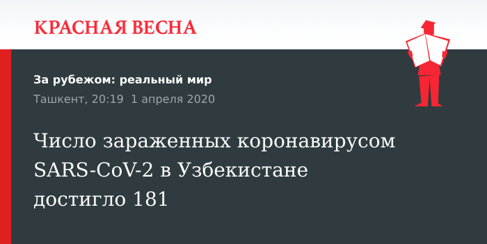 Число зараженных коронавирусом SARS-CoV-2 в Узбекистане достигло 181, сообщает 1 апреля пресс-служба минздрава Узбекистана.