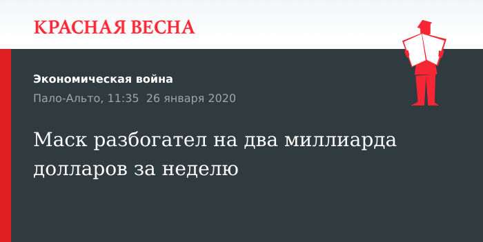 Причем если в понедельник 20 января состояние Маска составляло 30,9 млрд долларов, то к четвергу 23 января оно достигло отметки в 33,3 млрд долларов. Однако уже 25 января состояние миллиардера немного уменьшилось — на 300 млн долларов.