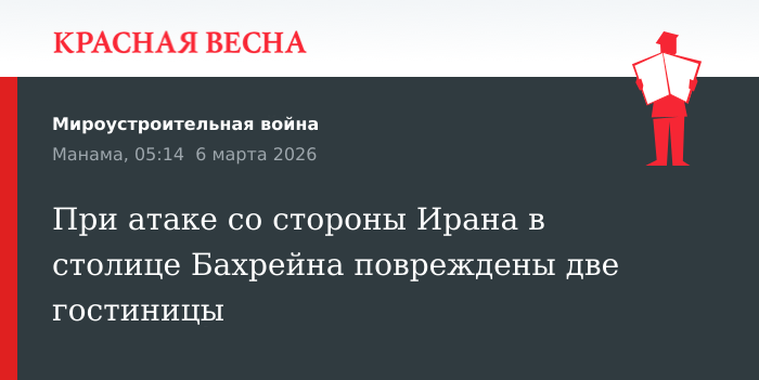 Под удар в ходе атаки со стороны Ирана попали две гостиницы и жилой дом в столице Бахрейна Манаме. Об этом сообщает 6 марта пресс-служба МВД королевства.