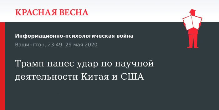 Американский лидер анонсировал в ближайшее обнародование документа, который будет призван защитить «жизненно важные исследования в университетах» США. Отмечается, что данный документ наложит вето на посещение Соединенных Штатов китайскими деятелями науки, которые «представляют потенциальную угрозу безопасности» США.