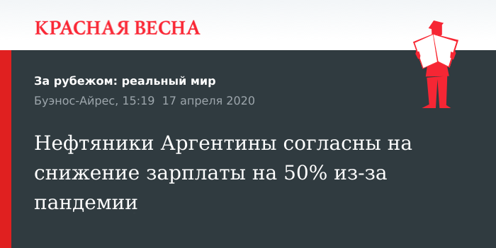 Согласие на сокращение заработной платы более чем на 50% среди своих организаций-членов для сохранения рабочих мест в отрасли дал лидер крупнейшего в Аргентине профсоюза нефтяников Гильермо Перейра, 17 апреля сообщает La Política Online.