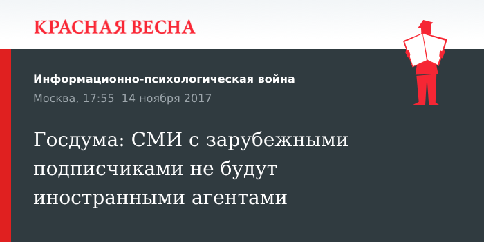 Напомним, в Госдуме готовятся поправки в закон о СМИ, которые будут устанавливать критерии отнесения масс-медиа к иностранным агентам. 14 ноября спикер Госдумы Петр Толстой сообщил о согласовании текста поправок с четырьмя ведущими фракциями. Считается, что иностранными агентами будут признаны «Голос Америки», «Свобода», «Немецкая волна» и CNN. Данные поправки стали ответом на решение властей США о признании российского телеканала RT иностранным агентом.
