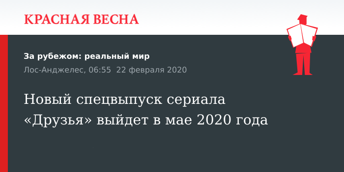 Воссоединение актеров популярного сериала «Друзья» произойдет в мае 2020 года в спецвыпуске, сообщает 21 февраля сайт WarnerMedia.