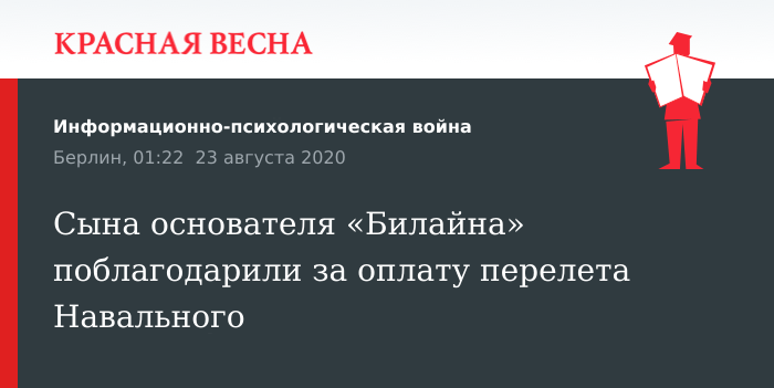 Благодарность за оплату перелета Навального в Германию выразил сыну основателя «Билайна» Борису Зимину менеджер проектов ФБК (НКО, выполняющее функции иностранного агента) Леонид Волков, сообщает 22 августа Deutsche Welle.