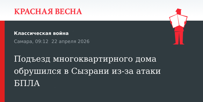 Подъезд многоквартирного жилого дома частично обрушился в результате атаки украинских беспилотных летательных аппаратов, заявил губернатор Самарской области Вячеслав Федорищев 22 апреля в своем Max-канале.