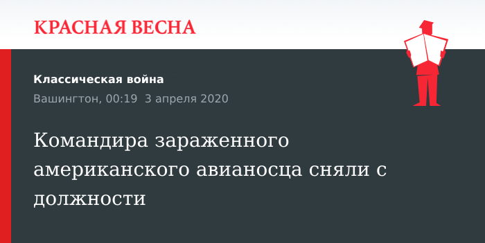 Напомним, экипаж атомного авианосца «Теодор Рузвельт» частично эвакуирован из-за разразившейся на нем вспышки коронавирусной инфекции. Корабль находится в порту недалеко от Токио, на базе ВМС США Йокосука.