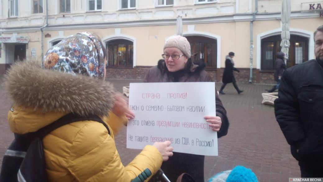 Закон о семейно-бытовом насилии принесет в российские семьи полное беззаконие и произвол, заявила участник одиночного пикета 15 декабря в Калуге, сообщает корреспондент ИА Красная Весна.
