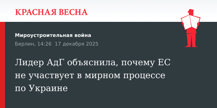 Для восстановления мира на Украине необходимы прямые переговоры между странами Европейского союза (ЕС) и Россией, заявила лидер правой партии «Альтернатива для Германии» (АдГ) Алис Вайдель 17 декабря в выступлении, опубликованном на ее странице в соцсети Х.