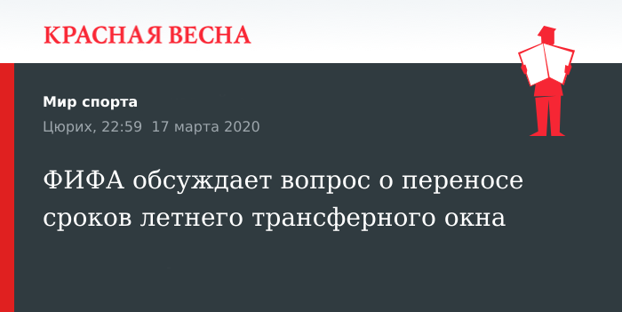 Вопрос о переносе начала и закрытия летнего трансферного окна в связи с приостановкой большинства чемпионатов обсуждает Международная федерация футбола (ФИФА), 17 марта сообщает The Sun.