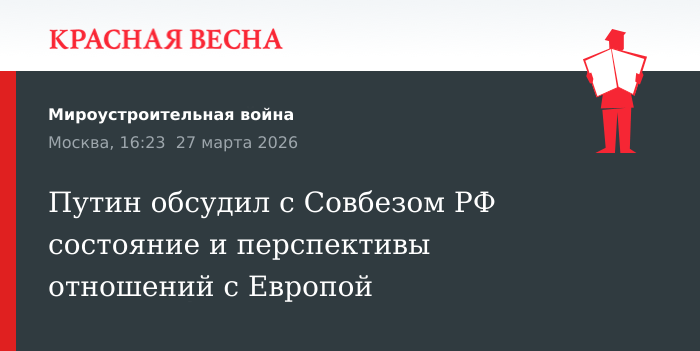 Состояние отношений с европейскими государствами и подходы к дальнейшей работе на европейском направлении предложил обсудить в ходе очередного совещания с постоянными членами Совета безопасности России президент Российской Федерации Владимир Путин 27 марта, сообщает пресс-служба российского лидера на своем официальном сайте.
