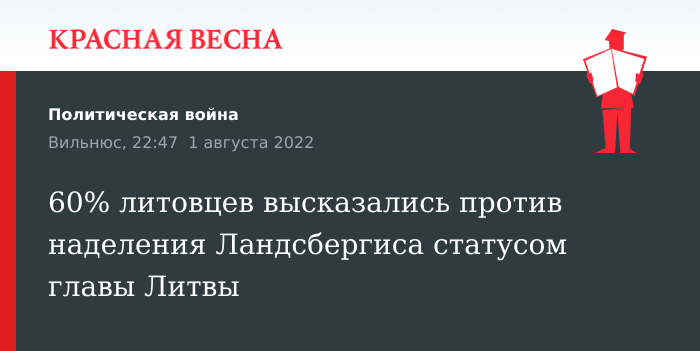 Шесть из десяти жителей Литвы не поддерживают признание председателя Верховного Совета страны Витаутаса Ландсбергиса главой государства, следует из опроса, компании Vilmorus, результаты которого обнародованы 1 августа агентством BNS.