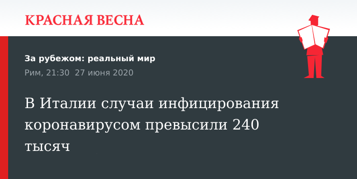 Количество подтвержденных случаев заражений коронавирусной инфекцией в Италии с начала эпидемии достигло 240 136 человек, 27 июня сообщает агентство ANSA.