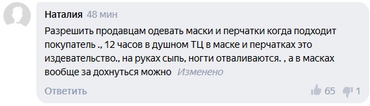 Действующие меры защиты от коронавируса вредят здоровью граждан, написала пользователь Наталья. По ее словам, от 12-часовой работы в маске человек начинает задыхаться, а от перчаток на руках появляется сыпь.