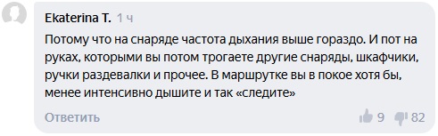 На спортивном снаряде человеку приходится чаще дышать, а пот после тренировки остается на предметах, попыталась объяснить запрет на работу спортивных залов пользователь Ekaterina T. По словам женщины, в автобусе гражданин «менее интенсивно дышит». Это замечание получило негативные оценки других пользователей сервиса.