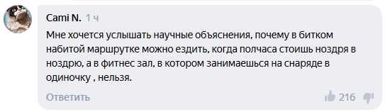 Причину долгого простоя спортивных залов попытался понять пользователь Cami N. По его замечанию, горожанам не хватает научного объяснения запрета на одиночные занятия в спортивном зале, когда приходится передвигаться по городу в «битком набитой маршрутке», стоя «ноздря в ноздрю».