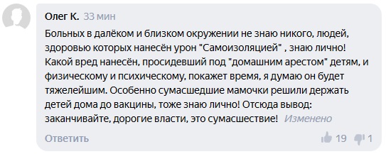 Самоизоляция, похожая на домашний арест, навредила детям — физически и психически, уверен пользователь Олег К. По его словам, здоровью людей нанесен урон. Олег К. потребовал от властей скорее закончить «это сумасшествие».