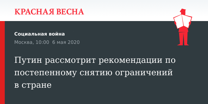 Рекомендации по постепенному смягчению ограничительных мер, введенных в стране из-за коронавируса, сегодня будут переданы президенту России Владимиру Путину, 6 мая сообщили «Ведомости».