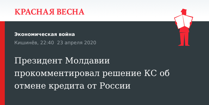 Напомним, 20 апреля Конституционный суд Молдовы приостановил вступление в силу закона о получении кредита от России в размере 200 млн евро. В связи с неблагоприятной эпидемиологической обстановкой 17 апреля был пересмотрен бюджет республики на 2020 год, его дефицит составил 900 млн долларов.