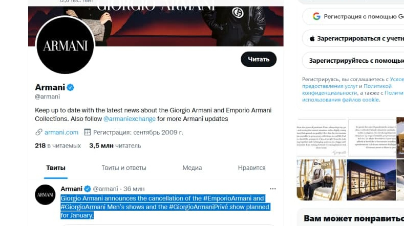 Также сорвался показ коллекции Giorgio Armani Priv сезона «весна — лето 2022». Его планировалось представить в Париже в рамках Недели высокой моды.