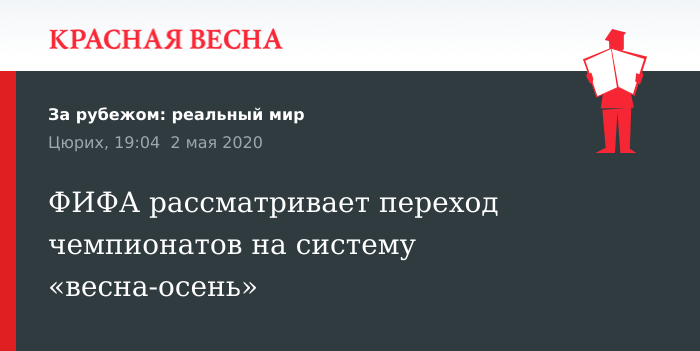 Международная федерация футбола (ФИФА) обсудит на национальном и континентальном уровнях возможный вариант перехода клубного европейского сезона на систему, которая подразумевает начало чемпионатов в конце зимы — начале весны, а завершение осенью, заявил вице-президент ФИФА Виктор Монтальяни 2 мая в интервью Tuttosport.
