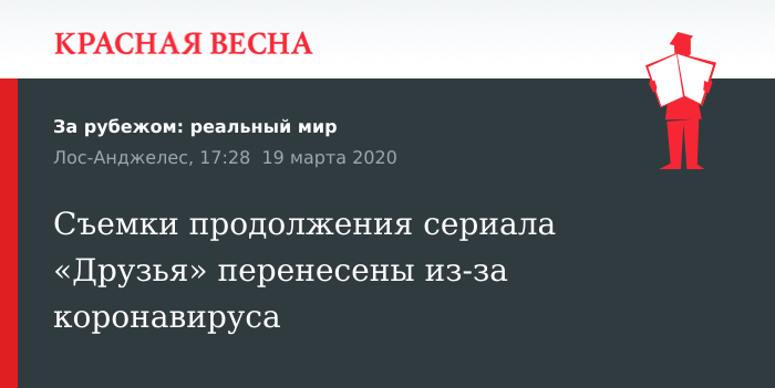 Начало съемок продолжения ранее популярного сериала «Друзья» с воссоединенным актерским составом было перенесено из-за угрозы распространения инфекции коронавируса, 18 марта сообщает журнал Variety со ссылкой на источники.