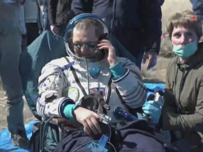 После приземления спускаемого аппарата с космонавтами, спасатели стали извлекать их из капсулы. На кадрах видно, что порядка десяти человек были задействованы в этой процедуре, все они были в медицинских масках и перчатках.