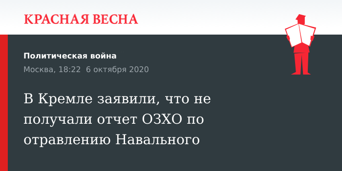 Какой-либо информацией относительно отчета экспертов ОЗХО, содержащего выводы об отравлении Алексея Навального нервно-паралитическим веществом из группы «Новичок», Кремль пока не располагает, 6 октября заявил пресс-секретарь Кремля Дмитрий Песков.