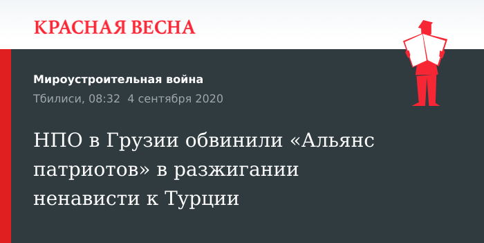 Жалобы о разжигании ненависти к Турции в предвыборных видеороликах оппозиционной партии «Альянс патриотов» написали в ЦИК Грузии местные неправительственные организации (НПО) «Международное общество справедливых выборов и демократии» (ISFED) и «Гражданская платформа «Скажи нет фобии». Об этом 3 сентября сообщает интернет-издание Netgazeti.