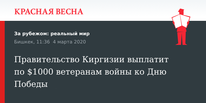 По словам пресс-службы, распоряжение о единовременных выплатах ветеранам войны подписал глава государства, «принимая во внимание всемирное историческое значение Победы над фашизмом в Великой Отечественной войне, отдавая дань глубокого уважения великому подвигу воинов-кыргызстанцев, выражая благодарность ветеранам за проявленные мужество и героизм, а также в честь 75-летия Победы».