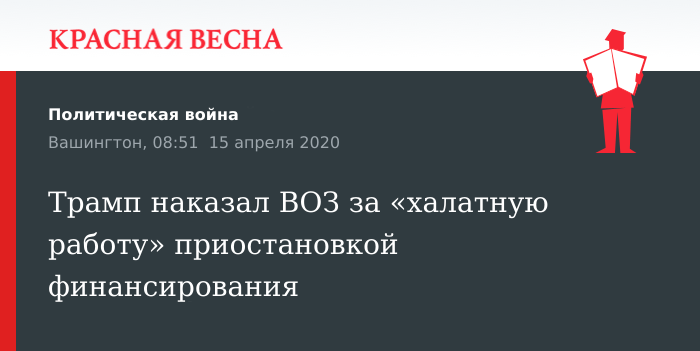 США прекращает спонсирование Всемирной организации здравоохранения (ВОЗ) на период анализа ее работы по противодействию пандемии коронавируса, заявил президент США Дональд Трамп 15 апреля на выступлении в Белом доме.