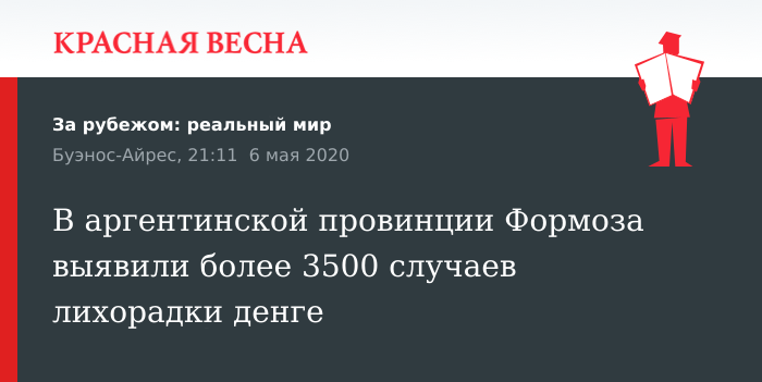 Количество случаев заболевания лихорадкой денге в провинции Формоза достигло 3510, заявил глава аргентинского Всеобщего совета по чрезвычайным ситуациям министр Хорхе Гонсалес, 5 мая сообщает Télam.