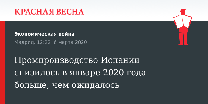 Промышленное производство в Испании сократилось в январе 2020 года на 2,1% по отношению к аналогичному периоду 2019 года, говорится в пресс-релизе испанского Национального института статистики, 6 марта опубликованного на сайте организации.