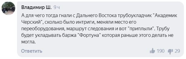 Некоторые пользователи высказали недоумение, поскольку ранее сообщалось, что уложить трубопровод в силу технологических особенностей способно только судно «Академик Черский».
