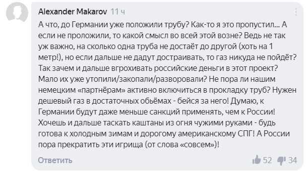 Некоторые пользователи удивляются настойчивости России, пытающейся реализовать выгодный Германии проект во что бы то ни стало и получающей за это наибольший урон от санкций. По их мнению, российскому руководству не стоит «таскать каштаны из огня» западным партнерам.